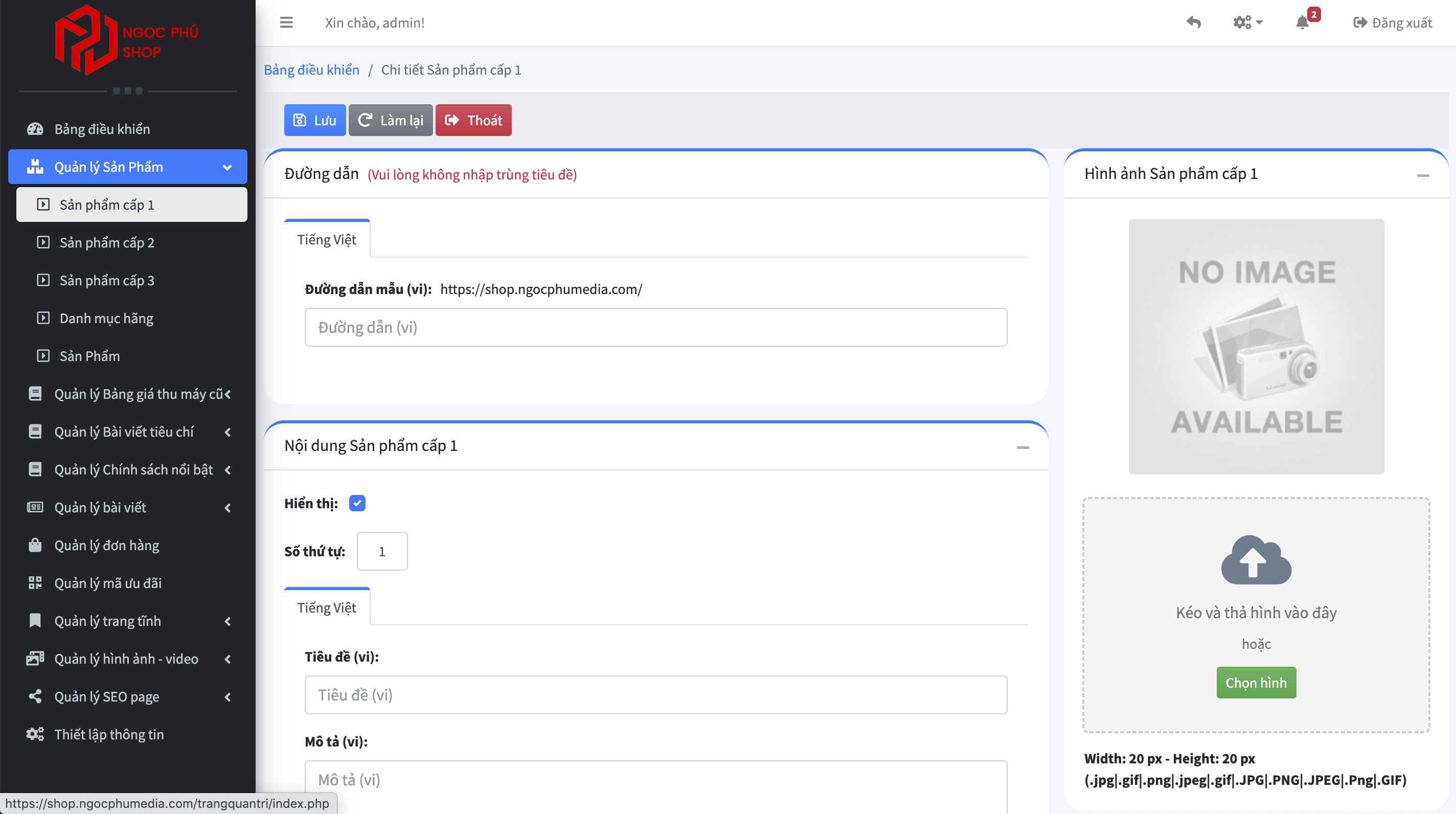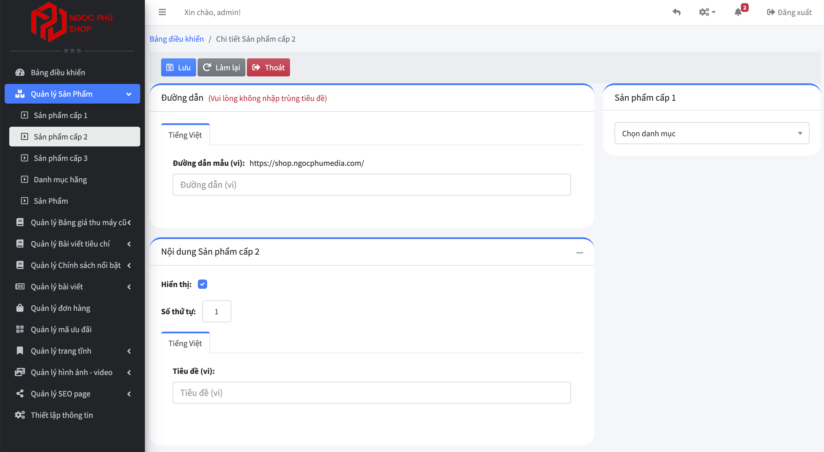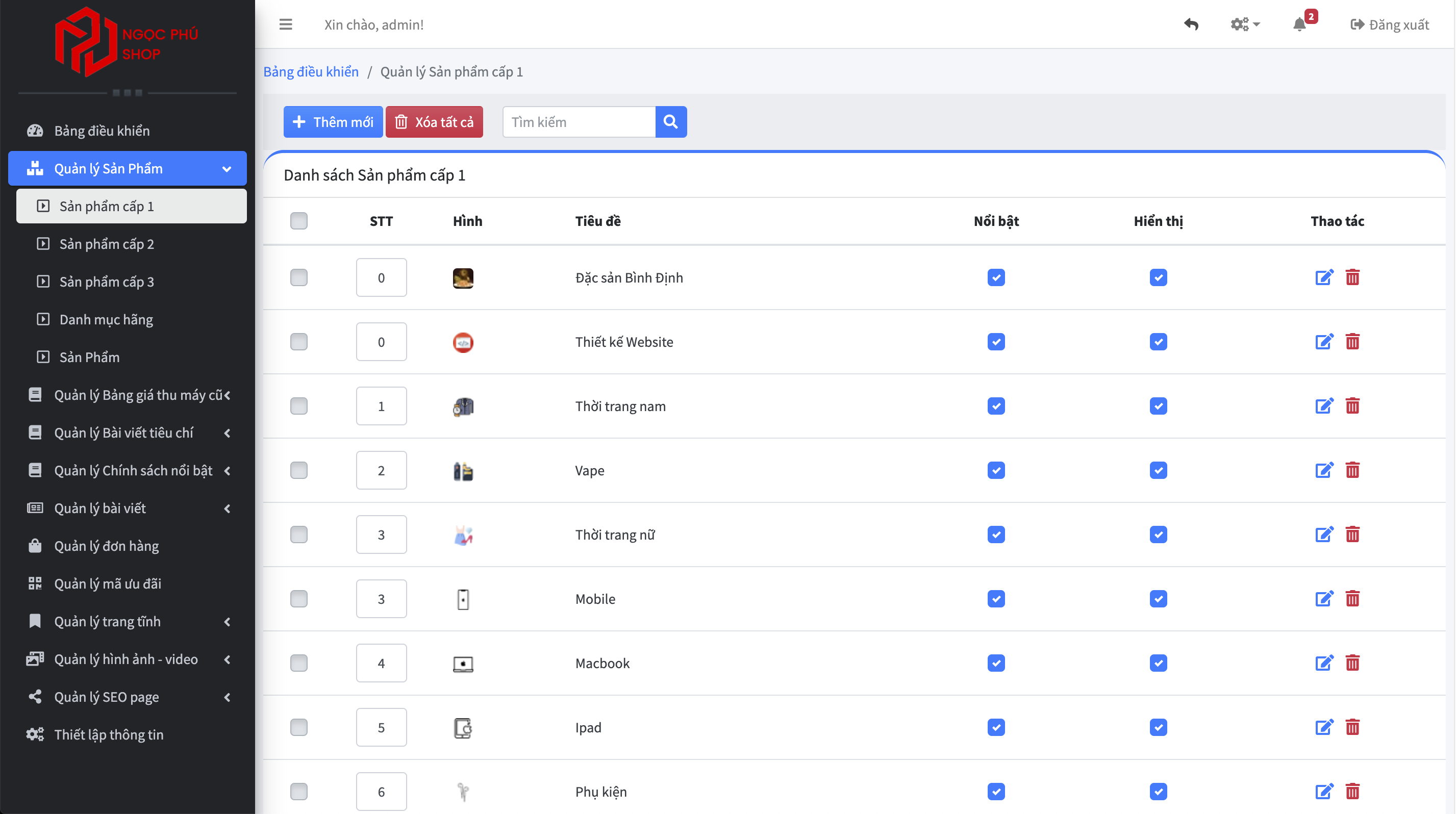 Danh mục sản phẩm sử dụng để phân loại sản phẩm của quý khách, nhằm mục đích khách hàng vào dễ lựa chọn 1 loại sản phẩm nhất định. Ví dụ như trong Áo có Áo Nam, Áo Nữ. Áo là cấp 1, Áo Nam - Áo Nữ là cấp 2.